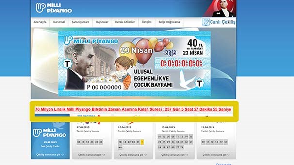 Açıklamanın altında ise biletin zaman aşımına ne zaman uğrayacağının gösterildiği sayaç uygulaması başlatıldı. Sayaca göre, bugün itibarıyla 70 milyon liralık büyük ikramiyenin isabet ettiği bilet, 257 gün sonra zaman aşımına uğrayacak.