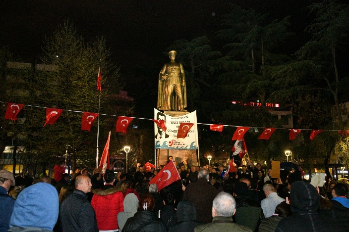 Kendilerinin demokrasi ve hukuk mücadelesini kimseye zarar vermeden sürdürdüklerine dikkati çeken Bak, “Buradan tüm Türkiye’ye özellikle siyasilere sesleniyorum, birileri gelip burada ne konuştuğuna dikkat edecek, bu halkı kimse birbirine düşürmesin. Bizler bu topraklarda yıllardır kardeşlik içerisinde yaşamış bir milletiz. İki tane aklı eksiği kullanarak burada bu milletin huzuruna, geleceğine, Cumhuriyetin temel değerlerine saldırmayı akıllarından çıkarsınlar. Bunlar, en büyük karşılığı bundan sonra bulacaklardır. Bu ülkede ne kadar dürüst, namuslu, vatansever insanlar varsa hepsi birer birer içeri alınıyor. Bizler bunun farkındayız. Bunlar tamamen siyasi gerekçelerle içeride tutulmaktadır ama bizler bugüne kadar nasıl namuslular, dürüstler, vatanseverler o kurtuluş mücadelesinde bu ülkeyi kurtarmışsak, bu insanlar bundan sonra da bu mücadeleden kaçmayacaktır. Bizler 12 gündün hak, hukuk için mücadele ediyoruz, kimseye zarar gelmedi. Bundan sonra da özellikle Trabzon’da hiç kimsenin canına malına zarar gelsin istemiyoruz” şeklinde konuştu.