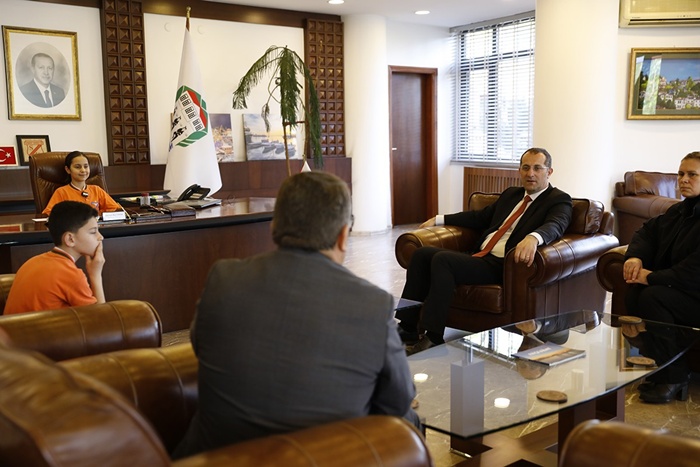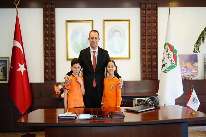 23 Nisan etkinlikleri kapsamında Yıldızlı TOKİ İlkokulu 4/F sınıfı öğrencileri Ayşe Ergüden ve Yusuf Sağır, sınıf öğretmenleri Ayten Şimşek ve Okul Müdürü Engin Ocak ile birlikte Akçaabat Belediye Başkanı Osman Nuri Ekim’i ziyaret etti. Başkanlık makamına oturan öğrenciler, bu anlamlı günde belediye başkanlığı görevini temsili olarak üstlenmenin mutluluğunu yaşadı.