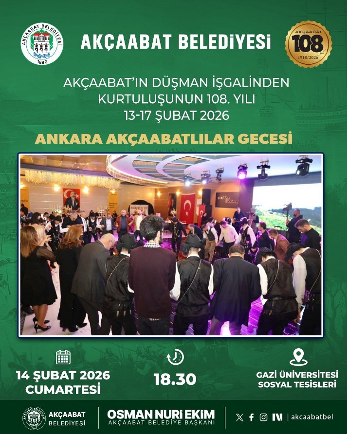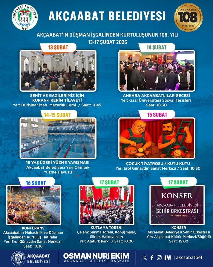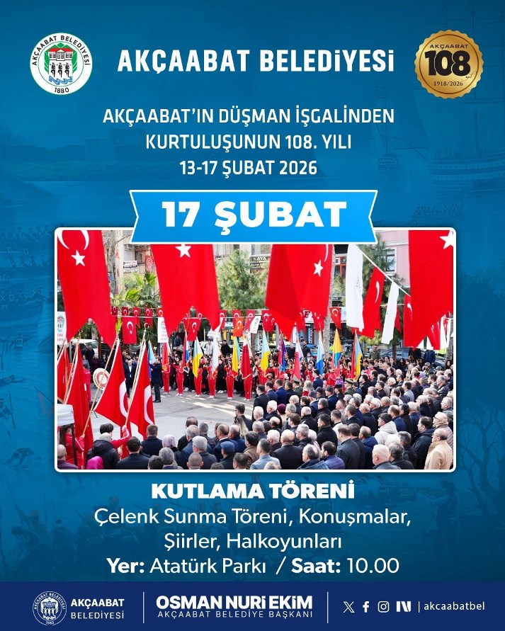 Akçaabat’ın düşman işgalinden kurtuluşunun 108. yılı, 13–17 Şubat 2026 tarihleri arasında Akçaabat Belediyesi tarafından düzenlenecek çeşitli etkinliklerle coşkuyla kutlanacak.