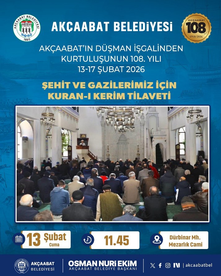 Kurtuluş Haftası programı, 13 Şubat 2026 Cuma günü şehit ve gazilerimiz için Dürbinar Mahallesi Mezarlık Camii’nde okutulacak Kur’an-ı Kerim tilavetiyle başlayacak. 14 Şubat Cumartesi günü Ankara’da düzenlenecek Akçaabatlılar Gecesi ile hemşehrilerimiz bir araya gelirken, 14–15 Şubat tarihlerinde Akçaabat Belediyesi Yarı Olimpik Yüzme Havuzu’nda 18 yaş üstü yüzme yarışmaları gerçekleştirilecek.
