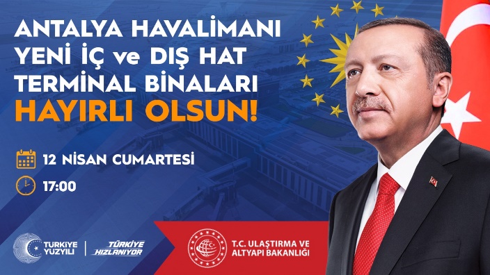 Antalya Havalimanı yeni terminal binaları bugün, Cumhurbaşkanı Recep Tayyip Erdoğan’ın teşrifleri, Ulaştırma ve Altyapı Bakanı Abdulkadir Uraloğlu’nun katılımlarıyla saat 17.00’de hizmete açılıyor. Bakan Uraloğlu yaptığı açıklamada, “Antalya Havalimanı’mızın yeni terminal binalarının açılışını gerçekleştirerek, ülkemizin hem havacılık hem de turizm alanındaki önemli projelerinden birini daha milletimizin hizmetine sunmanın gururunu yaşayacağız.” ifadelerini kullandı.