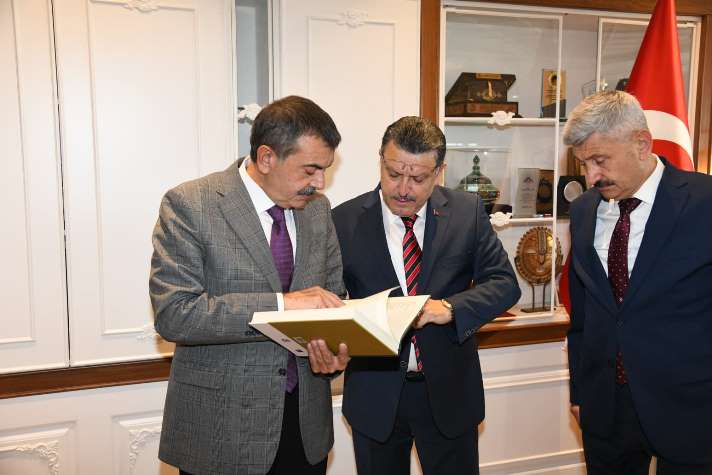 Başkan Genç, Bakan Tekin’e Trabzon’a sunduğu katkılardan dolayı teşekkür etti. Genç, “Şehrimizde eğitimi sizlerin desteği ile bütün kurumlarımızla el ele vererek daha ileriye taşıyoruz. Şehrimizde sizleri ağırlamaktan çok mutluyuz. Sunduğunuz katkılardan dolayı teşekkür ediyorum” dedi. Ziyarette Başkan Genç, Bakan Tekin’e, telkâri ve Yavuz Sultan Selim kitabı hediye etti. Tekin daha sonra şeref defterini imzaladı.