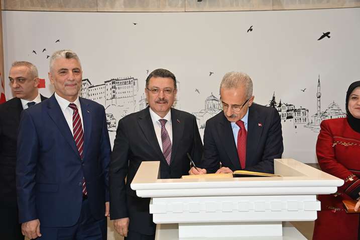 Bir dizi programlara katılmak üzere Trabzon’a gelen Ulaştırma ve Altyapı Bakanı Abdulkadir Uraloğlu ve Ticaret Bakanı Ömer Bolat’ın Büyükşehir Belediye Başkanı Ahmet Metin Genç’i ziyaretlerine; Trabzon Valisi Aziz Yıldırım, önceki dönem Ulaştırma ve Altyapı Bakanı ve Trabzon Milletvekili Adil Karaismailoğlu, AK Parti Genel Başkan Yardımcısı ve Trabzon Milletvekili Mustafa Şen, AK Parti Yerel Yönetimler Başkan Yardımcısı Trabzon eski Milletvekili Ayşe Sula Köseoğlu, ilçe belediye başkanları, AK Parti İl Başkanı Sezgin Mumcu ve AK Parti Kadın Kolları Başkanı Ayfer Cihan eşlik etti. Bakanlara ziyaretlerinden dolayı teşekkür eden Başkan Genç, şehirde devam eden ve yapılması planlanan projelerle ilgili bilgi verdi. Bakan Uraloğlu ve Bakan Bolat Trabzon’un her zaman yanında olacaklarını ve projelere destek vermeye devam edeceklerini söyledi. Ziyaret, hediye takdimi, bakanların şeref defterini imzalaması ve hatıra fotoğrafı çekilmesinin ardından sona erdi.