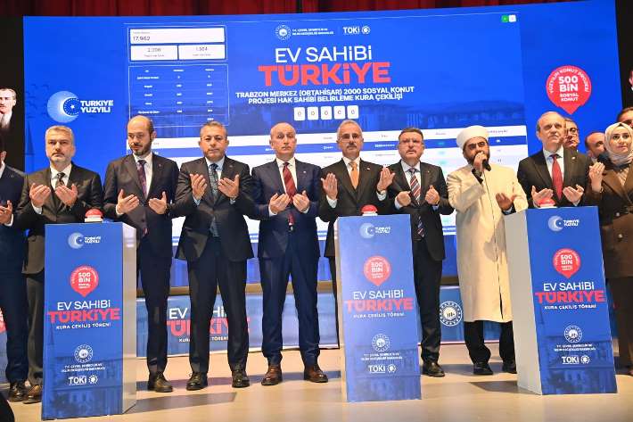 Türkiye’nin 81 ilinde 500 bin sosyal konutun inşa edileceği ‘Yüzyılın Konut Projesi’ çerçevesinde Çevre, Şehircilik ve İklim Değişikliği Bakanlığı tarafından Trabzon’da yapılacak 3 bin 734 sosyal konut için kura çekiliş programı düzenlendi. Bakanlığa bağlı Toplu Konut İdaresi (TOKİ) tarafından yaptırılacak konutlar için gerçekleştirilen ve ev sahipliğini Trabzon Büyükşehir Belediye Başkanı Ahmet Metin Genç’in yaptığı kura çekiliş törenine, Ulaştırma ve Altyapı Bakanı Abdulkadir Uraloğlu, Çevre, Şehircilik ve İklim Değişikliği Bakanlığı Bakan Yardımcısı Ömer Bulut, Trabzon Valisi Tahir Şahin, TOKİ Başkanı Mustafa Levent Sungur, TOKİ Başkan Yardımcısı Murat Aydın, AK Parti Trabzon İl Başkanı Sezgin Mumcu, kent protokolü, ilçe belediye başkanları, siyasi parti ve sivil toplum kuruluşu temsilcileri ile sosyal konut başvurusunda bulunan çok sayıda vatandaş katıldı.