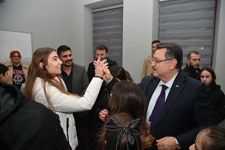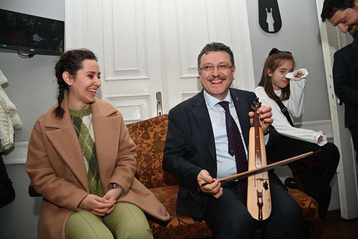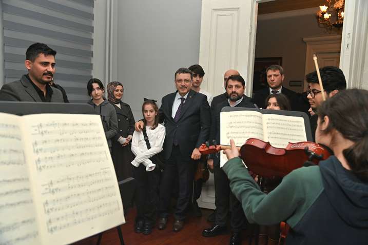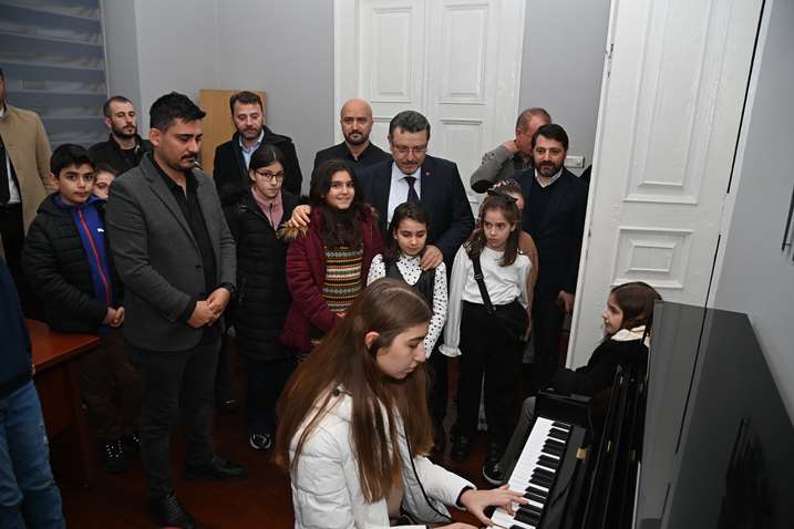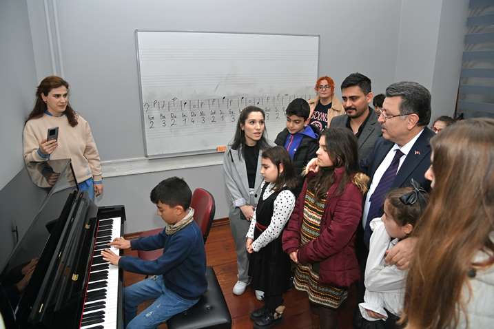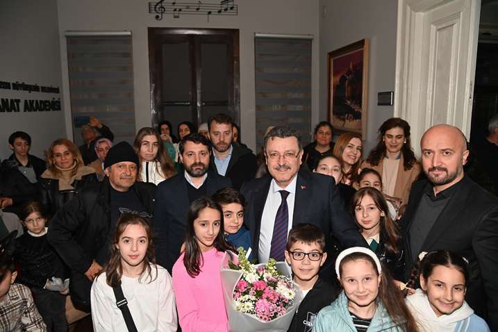 Trabzon Büyükşehir Belediye Başkanı Ahmet Metin Genç, Büyükşehir Belediyesi Sanat Akademisi’ni ziyaret ederek müzik eğitimine katılan öğrencilerle bir araya geldi. 8-15 yaş arası çocuklar ve her yaş grubundan yetişkinlere yönelik 5 farklı branşta ücretsiz müzik kurslarının düzenlendiği akademide, derslikleri gezerek eğitmenlerden çalışmalar hakkında bilgi alan Başkan Genç, öğrencilerin piyano, kemençe, gitar, bağlama ve keman performanslarını dinledi. Öğrencileri başarılarından dolayı tebrik eden Başkan Genç, Sanat Akademisi’nin haftanın her günü devam eden kurslarında Trabzon’un kültürel mirasını yaşatacak yeni yeteneklerin yetiştiğini belirtti.
