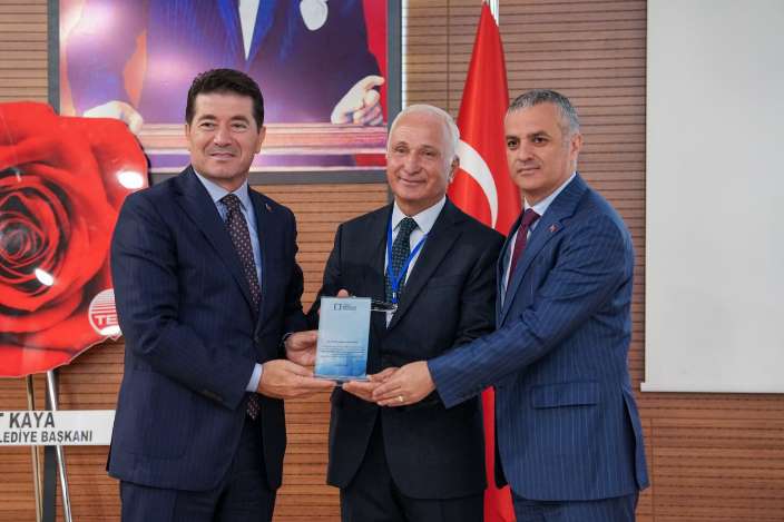 KTÜ Mimarlık Fakültesi Şehircilik Anabilim Dalı Başkanı Prof. Dr. Ahmet Melik Öksüz’ün ‘Geçmişten Günümüze Doğu Karadeniz Kentleri’ konulu sunumunu dinleyen Başkan Kaya, Prof. Dr. Öksüz’e plaket verdi.