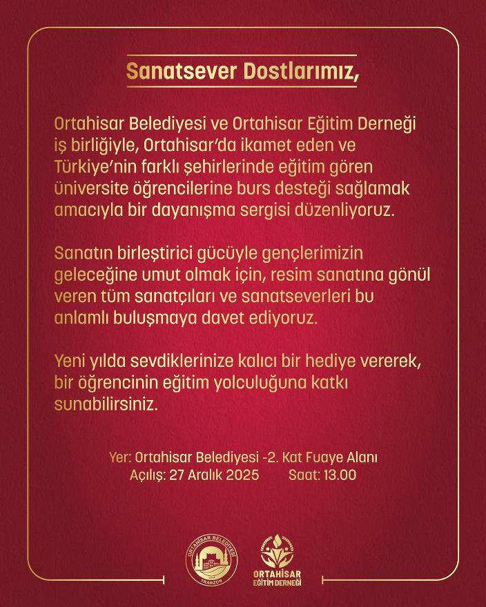 Burs kampanyasıyla çok sayıda ihtiyaç sahibi öğrenciye destek sağlayan Ortahisar Belediyesi, bu kez sanatı dayanışmanın merkezine alıyor. Ortahisar Belediyesi, Ortahisar Eğitim Derneği iş birliğiyle, üniversite öğrencilerine burs desteği sağlamak amacıyla bir resim sergisi düzenliyor. Belediyenin -2. Kat Fuaye Alanı’nda sanatseverlerle buluşacak serginin açılışı, 27 Aralık 2025 Cumartesi günü saat 13.00’te gerçekleştirilecek.