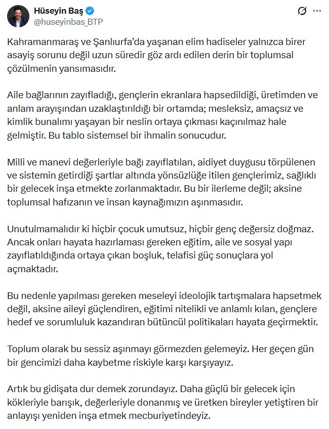 Sosyal medya hesabından açıklama yapan BTP lideri, “Yaşanan elim hadiseler yalnızca birer asayiş sorunu değil uzun süredir göz ardı edilen derin bir toplumsal çözülmenin yansımasıdır.” dedi.