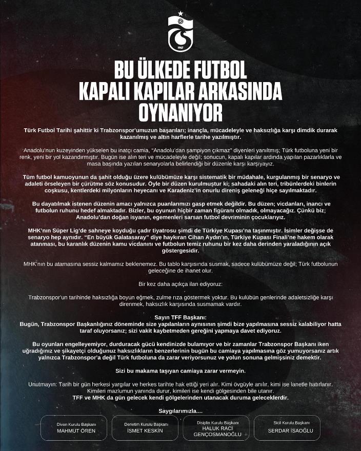 Tüm futbol kamuoyunun da şahit olduğu üzere kulübümüze karşı sistematik bir müdahale, kurgulanmış bir senaryo ve adaleti örseleyen bir çürütme söz konusudur. Öyle bir düzen kurulmuştur ki; sahadaki alın teri, tribünlerdeki binlerin coşkusu, kentlerdeki milyonların heyecanı ve Karadeniz’in onurlu direniş geleneği hiçe sayılmaktadır.