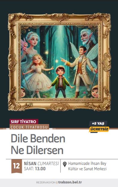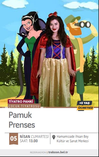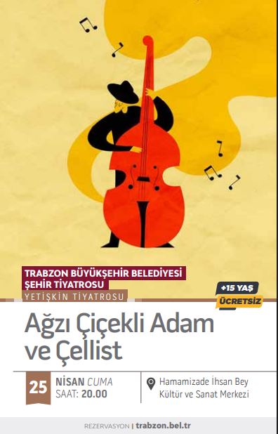 Tiyatroseverler için de zengin bir program hazırlandı. Hamamizade İhsan Bey Kültür ve Sanat Merkezi’nde gerçekleşecek Tiyatro etkinlikleri kapsamında; 11 Nisan Cuma günü saat 20.00’da, Sırf Tiyatro ekibi ‘Konakta Bir Düğün’ adlı oyunla sahne alacak. Aynı ekip, 11 Nisan Cumartesi günü saat 13.00’da ‘Dile Benden Ne Dilersen’ adlı oyunu sahneleyecek. 13 Nisan Pazar günü saat 13.00’da ise ‘Ormanın Hazinesi’ adlı çocuk tiyatrosu izleyicilerle buluşacak. 18 Nisan Cuma günü saat 20.00’da Azerbaycan Gence Devlet Milli Tiyatro ekibi, ‘Toros Canavarı’ adlı oyunla sahneye çıkacak. 19 Nisan Cumartesi günü saat 13.00’da ise Tiyatro D010 ekibi, ‘Ayı Tofi Bal Yolunda’ adlı çocuk tiyatrosunu izleyicilerle buluşturacak. 20 Nisan Pazar günü aynı ekip, saat 13.00’da ‘Orman Koruyucuları’ adlı oyununu sahneleyecek. Trabzon Büyükşehir Belediyesi Şehir Tiyatrosu ise 25 Nisan Cuma günü saat 20.00’da ‘Ağzı Çilekli Adam ve Çellist’ adlı oyunla sahne alacak. 26 Nisan Cumartesi günü saat 13.00’da Mim Organizasyon tarafından ‘İki Bavul Oyun’, 27 Nisan Pazar günü saat 13.00’da ise ‘Masal içinde Masal’ adlı oyunlar sahnelenecek.