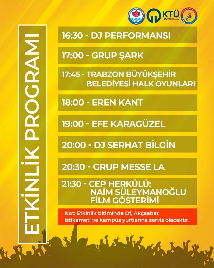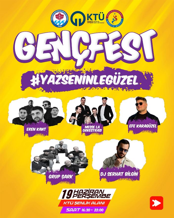 Trabzon Büyükşehir Belediyesi, yaz sezonunu renkli etkinliklerle karşılamaya hazırlanıyor. Büyükşehir Belediyesi Gençlik ve Spor Hizmetleri Dairesi Başkanlığı ile Karadeniz Teknik Üniversitesi işbirliğinde “Yaz Seninle Güzel” sloganıyla organize edilen KTÜ Gençlik Festivali (Genç Fest), Karadeniz Teknik Üniversitesi kampüsünde gerçekleştirilecek. Festival, yarın (19 Haziran Perşembe günü) saat 16.30’da başlayacak. DJ performansıyla açılışı gerçekleştirilecek etkinlikler Grup Şark tarafından verilecek konserle devam edecek. Saat 17.45’te Trabzon Büyükşehir Belediyesi’nce halk oyunları gösterileri düzenlenecek. Etkinlikler, saat 18.00’de başlayacak Eren Kant konseriyle devam edecek. Saat 19.00’da ise Efe Karagüzel sahne alacak. Saat 20.00’da gerçekleşecek DJ Serhat Bilgin’in performansının ardından, 20.30’da Messe La Orkestrası konser verecek. Müzik ve dans etkinliklerinin ardından, saat 21.30’da ‘Cep Herkülü Naim Süleymanoğlu’ filminin gösterimi yapılacak ve katılımcılara çeşitli ikramlarda bulunulacak.