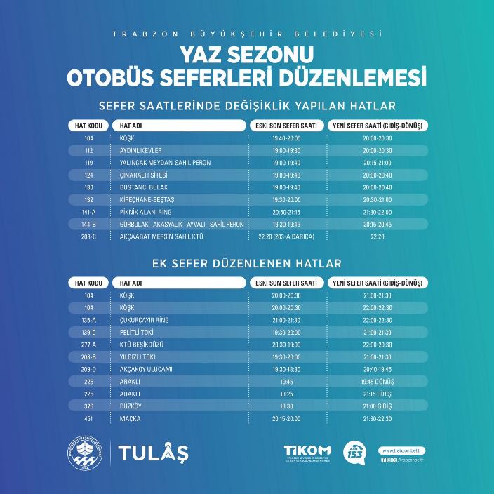 Buna göre saat değişikliği yapılan hatların gidiş-dönüş saatleri şu şekilde: Köşk 20.00-20.30, Aydınlıkevler 20.00-20.30, Yalıncak Meydan-Sahil Peron 20.15-21.00, Çınaraltı Sitesi 20.00-20.40, Bostancı Bulak 20.00-20.40, Kireçhane-Beştaş 20.30-21.00, Piknik Alanı ring 21.30-22.00, Gürbulak- Akasyalık-Ayvalı- Sahil peron 20.15-20.45, Akçaabat Mersin Sahil KTÜ 22.00.