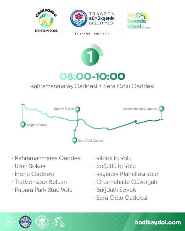 Trabzon Büyükşehir Belediyesi’nin ev sahipliğinde, Gençlik ve Spor Bakanlığı, Trabzon Valiliği ve Türkiye Bisiklet Federasyonu iş birliğiyle düzenlenecek olan ve Kahramanmaraş Caddesi’nden start alacak Gran Fondo Trabzon yarışı, 5 Temmuz’da gerçekleştirilecek. Yarış günü, etkinlik kapsamında bazı yollar belirli saat aralıklarında trafiğe kapatılacak.