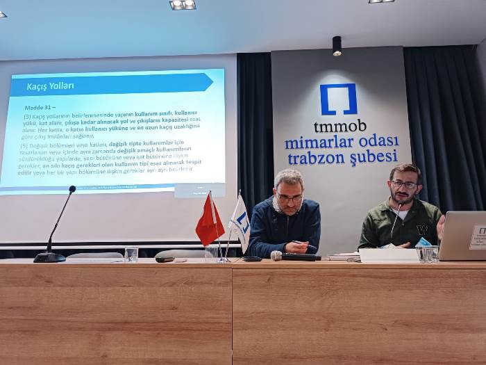 Trabzon Büyükşehir Belediyesi tarafından, Mimarlar Odası Trabzon Şubesi üyelerine, binalarda yangın güvenliği tedbirleri konusunda eğitim verildi. Büyükşehir Belediyesi İtfaiye Dairesi Başkanlığı Önleme Şube Müdürlüğü’nün uzman personeli tarafından verilen eğitim kapsamında, yasal rapor olan İtfaiye Raporu ve bu rapor düzenlenirken yapılarda dikkat edilmesi gereken hususlar ele alındı. Yapılan denetimler neticesinde karşılaşılan sorunların proaktif bir yaklaşımla önceden çözülebilmesi için, projeleri çizen mimarlarla iş birliği içinde hareket edilmesinin önemine dikkat çekildi.