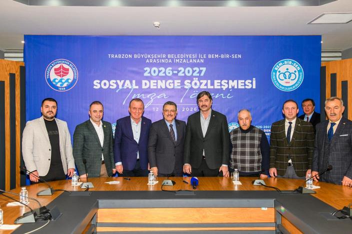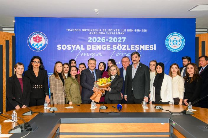 Trabzon Büyükşehir Belediyesi ve TİSKİ’de çalışan 1383 memurun sosyal haklardan en üst seviyede yararlanması adına, Trabzon Büyükşehir Belediyesi Toplantı Salonu’nda Büyükşehir Belediye Başkanı Ahmet Metin Genç ve Bem-Bir-Sen Genel Başkanı Levent Uslu arasında imza töreni düzenlendi. İmzalanan protokol doğrultusunda, Sosyal Denge Sözleşmesi kapsamındaki ödemelere tavan oran üzerinden zam yapılarak memurların gelirlerinde iyileştirme sağlandı. Çalışanların menfaatini gözetmeye özen gösterdiklerini ifade eden Büyükşehir Belediye Başkanı Ahmet Metin Genç, “Bizler, Büyükşehir Belediyesi ve bağlı kurumumuz TİSKİ’de görev yapan tüm mesai arkadaşlarımızın memnuniyetini ve huzurunu her zaman ön planda tuttuk. Sosyal Denge Sözleşmesi de bu anlayışın somut bir göstergesidir. Sendikamızla uzun yıllardır karşılıklı anlayış ve empatiyle çalışıyoruz. İmkanlarımız dahilinde çalışanlarımızın menfaatini gözetmeye özen gösteriyoruz. Memur personelimizi kapsayan bu sözleşmenin hayırlı olmasını diliyor, emeği geçen sendika yöneticilerimize ve özellikle sürece bizzat katılan Genel Başkanımıza teşekkür ediyorum. İnşallah hep birlikte verimli, huzurlu ve başarılı bir çalışma dönemini Rabbim bizlere nasip eder” ifadelerini kullandı.