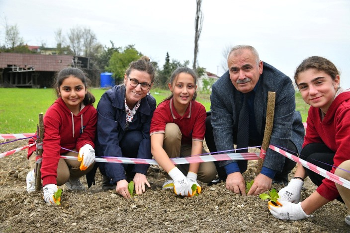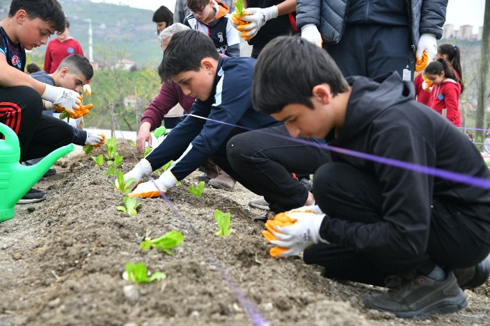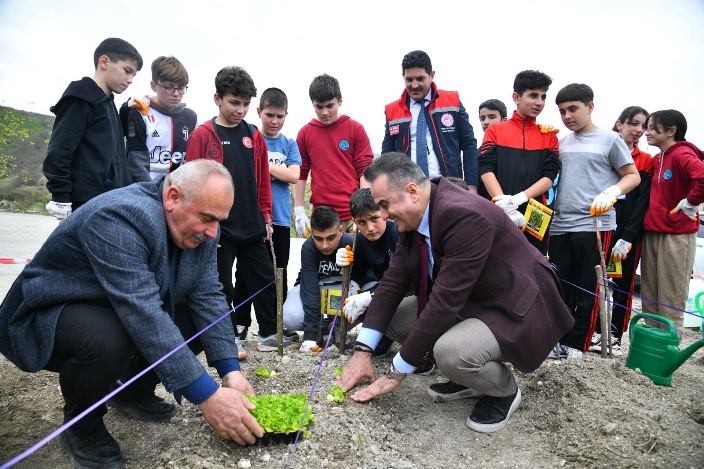 Akyazı Ortaokulu öğrencileri, belirlenen alanda uzmanların gözetiminde marul fidanı dikti, maydanoz, semizotu, dereotu ve roka tohumu ekti.