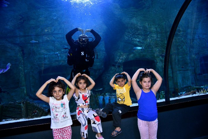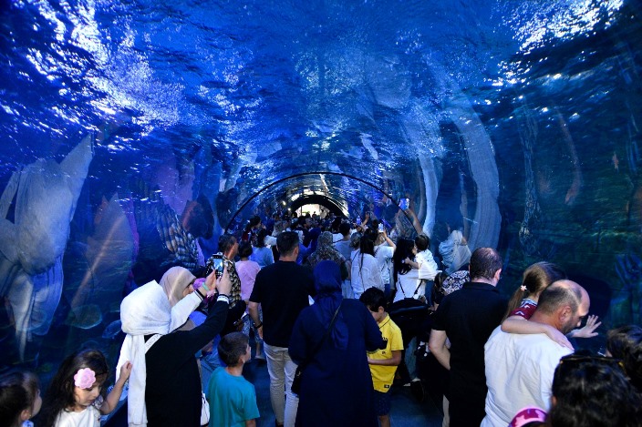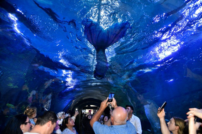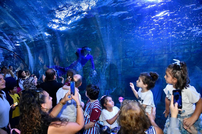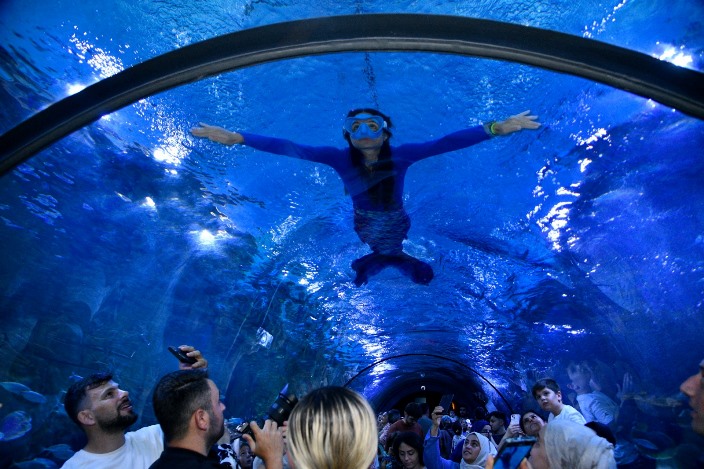 Beş dakika süren gösterilerde Deniz Kızı, renkli kostümüyle girdiği balıklarla dolu akvaryumda su içerisinde dans edip ziyaretçileri selamladı. Deniz Kızı’nın performansına alkışlarla eşlik eden ziyaretçiler, büyüleyici gösteriyi telefonlarla görüntüleyerek kayıt altına aldı. Zaman zaman akvaryumun camına yaklaşan Deniz Kızı, kendisini izleyenlerle hatıra fotoğrafı da çektirdi.