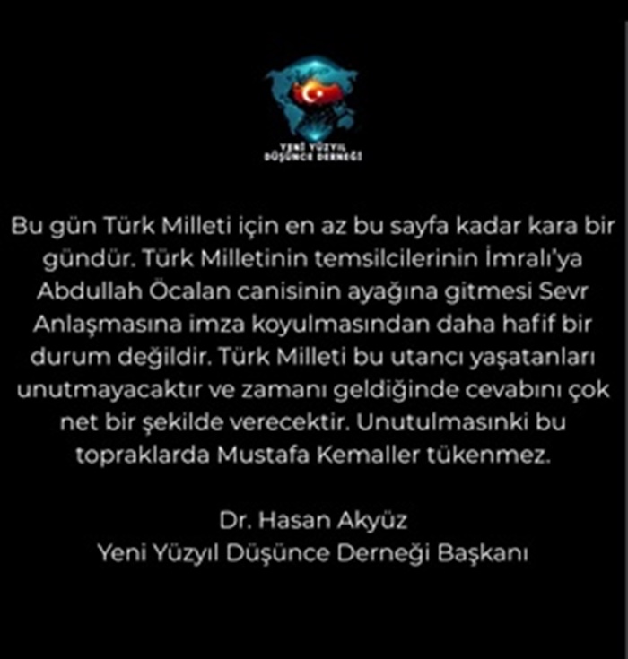 Y3Nİ YÜZYIL DÜŞÜNCE DERNEĞİ BAŞKANI HASAN AKYÜZ; TÜRK MİLLETİ BU UTANCI YAŞATANLARI UNUTMAYACAKTIR