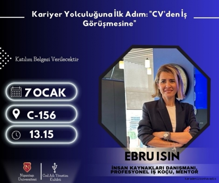 Yeni yılın ilk etkinliklerinden biri olan “Kariyer Yolculuğuna İlk Adım: CV’den İş Görüşmesi” başlıklı etkinlik, 7 Ocak Salı günü İstanbul Nisantaşı Üniversitesi Neotech Kampüsü’nde gerçekleşti. Cod Adı yönetim Kulubü tarafından düzenlenen etkinliğe, insan kaynakları alanında 22 yıllık tecrübesiyle tanınan İnsan Kaynakları Danışmanı Ebru ISIN konuşmacı olarak katıldı.
