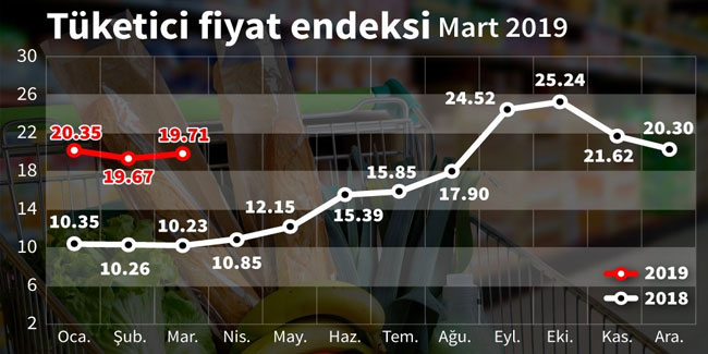 Türkiye yüksek enflasyona çare bulamıyor. Enflasyon 2019 yılı Mart ayında bir önceki aya göre yüzde 1,03, bir önceki yılın aynı ayına göre ise yüzde 19,71 arttı. Mart ayında fiyatı en çok artan ilk 7 ürün yine sebze ve meyve oldu.