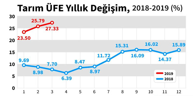 Tarım ürünleri üretici fiyat endeksi, 2019 yılı Mart ayında bir önceki aya göre yüzde 1,75, bir önceki yılın Aralık ayına göre yüzde 13,20, bir önceki yılın aynı ayına göre yüzde 27,33 ve on iki aylık ortalamalara göre yüzde 16,04 artış gösterdi.