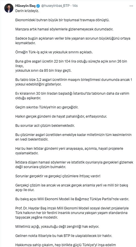 Sosyal medya hesabından açıklama yapan BTP lideri “Derin krizdeyiz” diyerek başladığı açıklamasında, “Geçim sıkıntısı Türkiye’nin acı gerçeğidir. Halkın gerçek gündemi de hayat pahalılığıdır, enflasyondur. Bu sorunlar acil çözüm beklemektedir. Hal bu iken iktidar gündemi yeni anayasayla, açılımla, hayali projelerle oyalamaktadır” dedi.