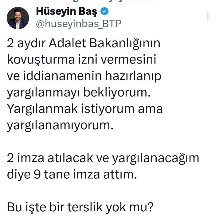 Cumhurbaşkanına hakaret iddiasıyla hakkında adli kontrol ve yurt dışı yasağı kararı verilen BTP lideri Hüseyin Baş sosyal medya hesabından dikkat çekici bir paylaşım yaptı.