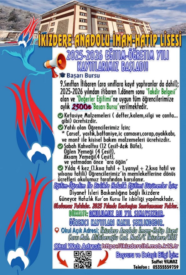 2025-26 eğitim öğretim yılı için yatılı olan okulun kayıtları sınırlıdır. Öğrenci kayıtlarının bu yıl sınavsız olduğu ve nakil yoluyla kayıt yapılabileceği belirtildi. Detaylı bilgi için İkizdere Anadolu İmam Hatip Lisesine başvuru yapılarak bilgi alınabilecek.