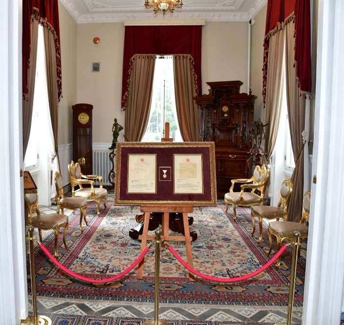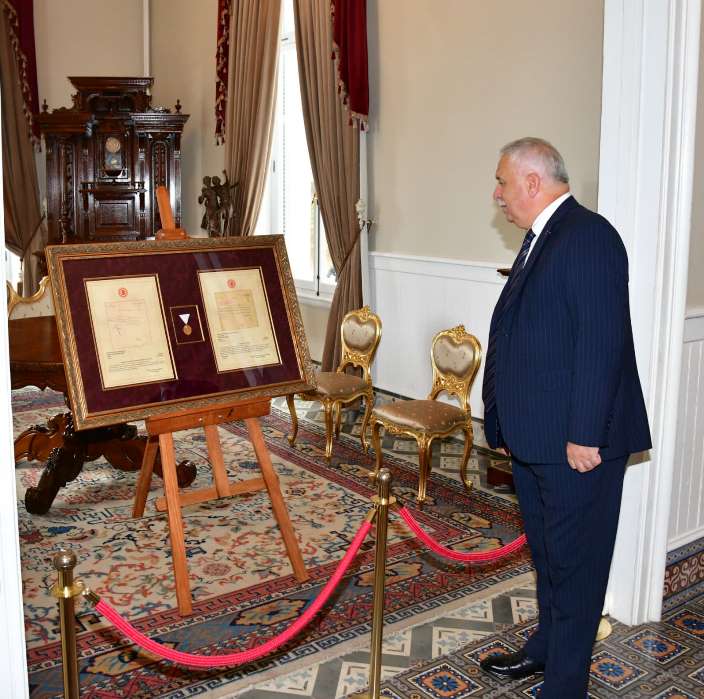 Eşi Güllühan Yıldırım Hanımefendi ile birlikte Atatürk Köşkü’nü ziyaret eden Trabzon Valisi Aziz Yıldırım, “Millî Mücadele’de Karadeniz’in hırçın dalgalarını aşarak cepheye silah ve mühimmat taşıyan kahraman ecdadımızın gurur nişanesi olan İstiklal Madalyası ve Beratı, Atatürk Köşkü’nde 1 Eylül’e kadar halkımızın ziyaretine açık olacaktır” dedi.????????