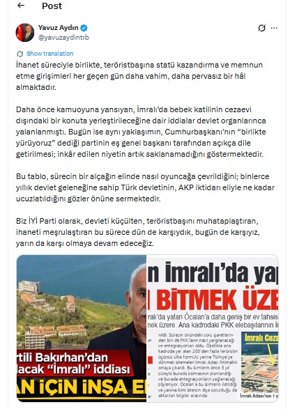 Daha önce kamuoyuna yansıyan, İmralı’da bebek katilinin cezaevi dışındaki bir konuta yerleştirileceğine dair iddialar devlet organlarınca yalanlanmıştı. Bugün ise aynı yaklaşımın, Cumhurbaşkanı’nın “birlikte yürüyoruz” dediği partinin eş genel başkanı tarafından açıkça dile getirilmesi; inkâr edilen niyetin artık saklanamadığını göstermektedir. Bu tablo, sürecin bir alçağın elinde nasıl oyuncağa çevrildiğini; binlerce yıllık devlet geleneğine sahip Türk devletinin, AKP iktidarı eliyle ne kadar ucuzlatıldığını gözler önüne sermektedir. Biz İYİ Parti olarak, devleti küçülten, teröristbaşını muhataplaştıran, ihaneti meşrulaştıran bu sürece dün de karşıydık, bugün de karşıyız, yarın da karşı olmaya devam edeceğiz.