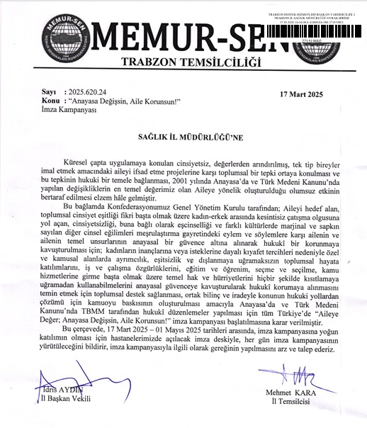 Kamuoyu tarafından yandaşlığı ile bilinen Memur Sen’in İl temsilciliği, siyasi iktidarın 2025 yılını “Aile Yılı” ilanı ve bu alandaki politikaları ile uyumlu bir biçimde durumdan vazife çıkararak “Anayasa Değişsin, Aile Korunsun” konulu bir imza kampanyası başlatmış bulunmaktadır.