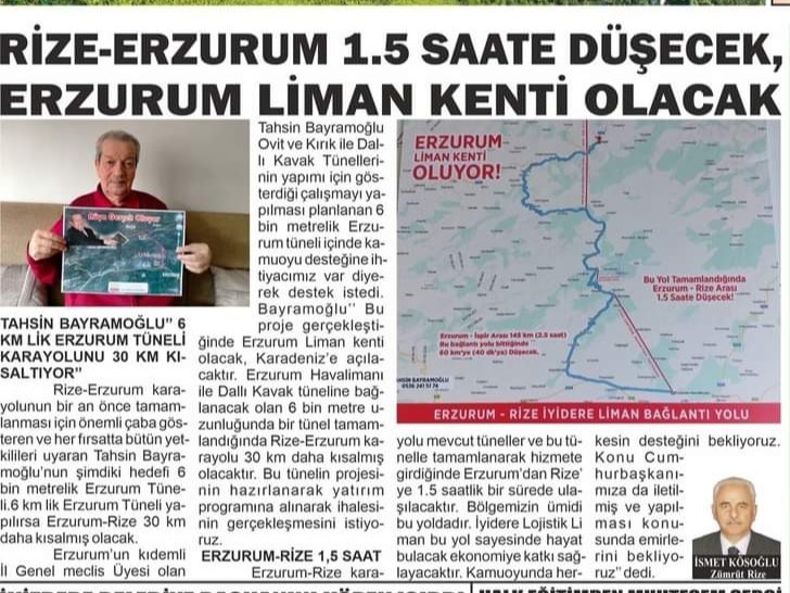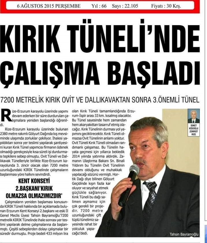 KIRIK TÜNELİNE TAHSİN BAYRAMOĞLU İSMİ  RİZE-ERZURUM KARAYOLU VE TÜNELLERİN YAPIMINI SÜREKLİ TAKİP EDEN TAHSİN BAYRAMOĞLU UNUTULMAMALI