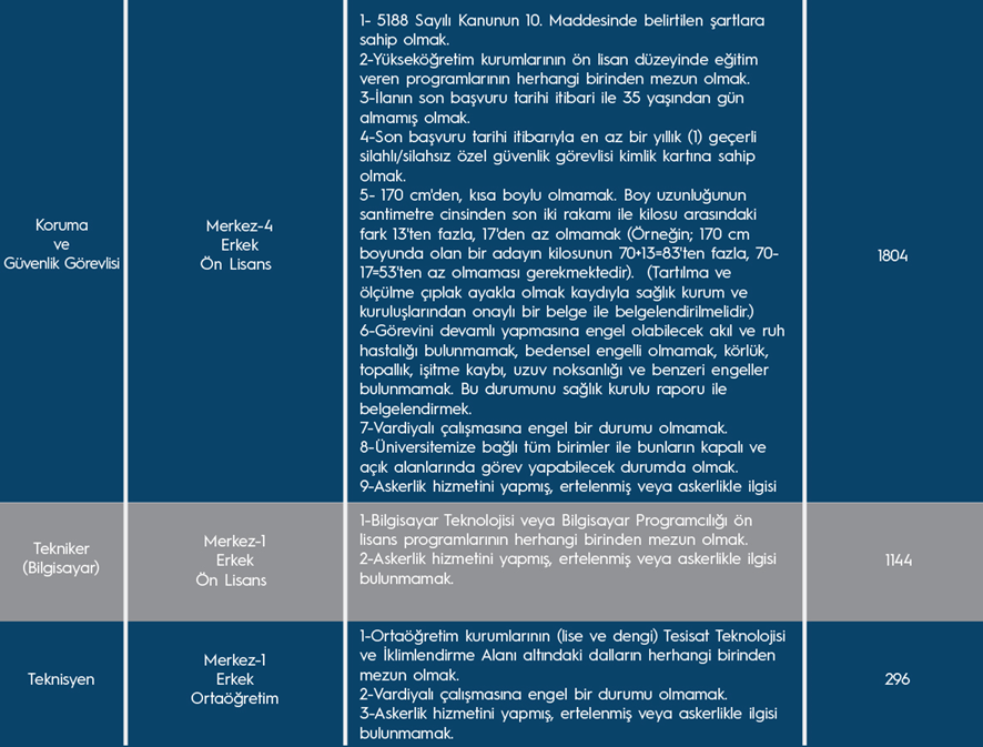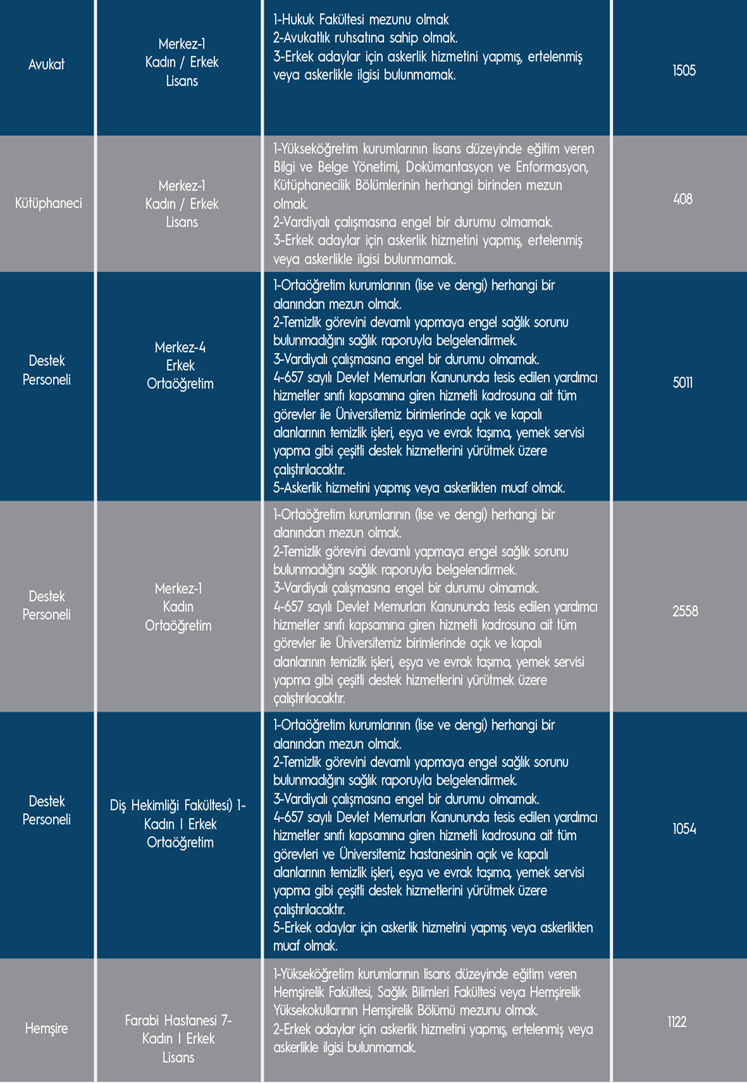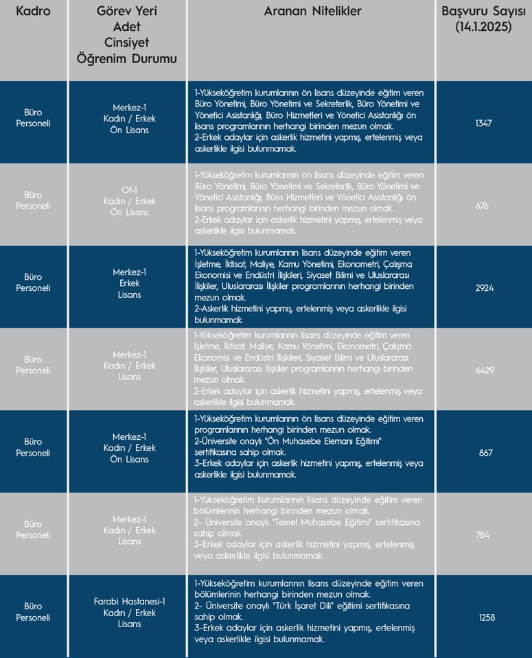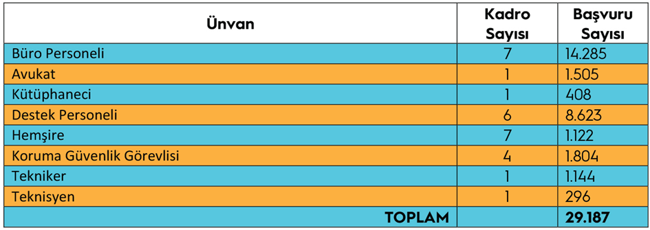 Farklı kategoriler altında sıralanan ve toplamda 28 personele ihtiyaç duyulan kadro ilanına, 29.187 adayın başvurduğu görüldü. İhtiyaç duyulan ilgili personel kadrosu ve bu kadrolara ilişkin aranan niteliklerin yer aldığı tablo ise aşağıda yer alan şekliyle paylaşıldı.