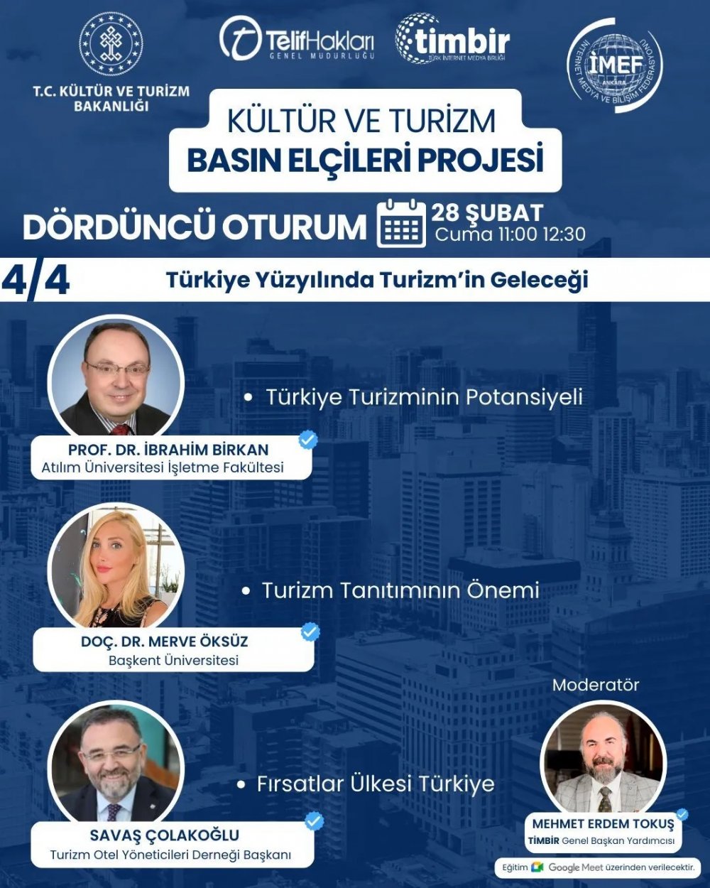 Kültür ve Turizm Bakanlığı, Telif Hakları Genel Müdürlüğü tarafından desteklenen, İnternet Medya ve Bilişim Federasyonu tarafından yürütülen medya mensuplarının kültür ve turizm haberciliğine daha duyarlı ve daha bilinçli haber yapılabilmesini teminen düzenlenen “Kültür ve Turizm Basın Elçileri” projesinin ikinci oturumda Türk İnternet Medya Birliği (TİMBİR) Genel Başkan Yardımcısı Mehmet Erdem Tokuş’un moderatörlüğünde gerçekleşti.
