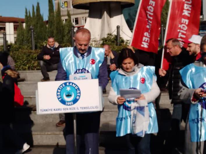 Türkiye genelinde yapılan açıklamalardan biri de Rize’de yapıldı.Memur ve emekliler adına açıklama yapan Türkiye Kamu Sen ve Rize Türk Eğitim-Sen Rize Şube başkanı Murat Köseoğlu: “2024 yılı enflasyon oranının %44 olarak açıklandığını ifade ederek:  memur ve emekli maaşlarının son 6 ayda %5,75 eridiğini,  Gıda fiyatlarının %433,6, okul masraflarının %91, haberleşme giderlerinin ise %34 arttığı bir ortamda, maaşlara yapılan %6+5 zam oranlarının gerçekçi değildir” dedi