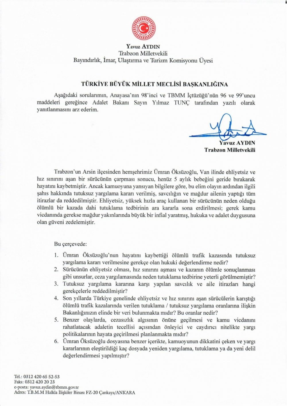 Milletvekili Aydın, Bakan Tunç’a yönelttiği sorularda; Ümran Öksüzoğlu’nun hayatını kaybettiği bu kazada tutuksuz yargılama kararının hangi hukuki gerekçeyle verildiğini, sürücünün ehliyetsizliği ve hız sınırını aşmasının tutuklama için neden yeterli görülmediğini ve savcılığın, aile avukatlarının itirazlarının hangi gerekçelerle reddedildiğini sordu.