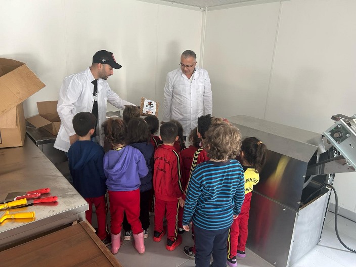 Tesis sorumlusu Mustafa Mankan, öğretmenleriyle birlikte tesisi ziyaret eden miniklere, mama üretiminde kullanılan malzemelerin nasıl ve nereden toplandığını, bu malzemelerin hangi işlemlerden geçirilerek mamaya dönüştürüldüğünü anlattı.