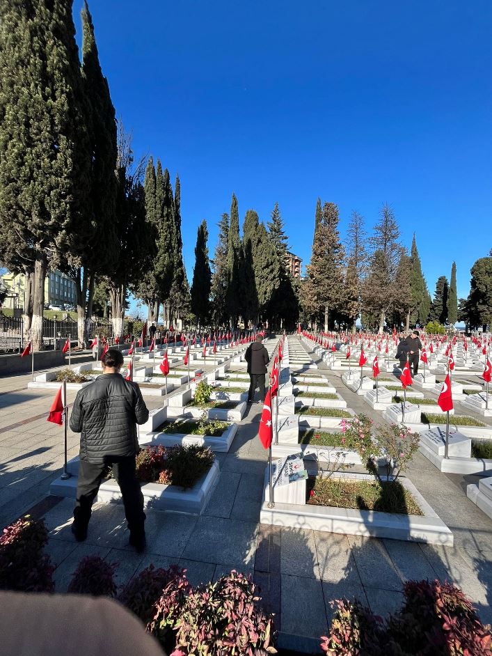 Program kapsamında önce aziz şehitlerimizin ebedî istirahatgâhı olan şehitlik ziyaret edilerek dualar edildi. Trabzon Büyükşehir Belediye Başkanı Ahmet Metin Genç, Trabzon Büyükşehir Belediyesi Genel Sekreter Yardımcısı Hasan Selim, Sonnokta Gazetesi Genel Yayın Yönetmeni Hasan Bahadır ve trabzonx.com haber portalının katkılarıyla şehit mezarlarına güller bırakıldı.