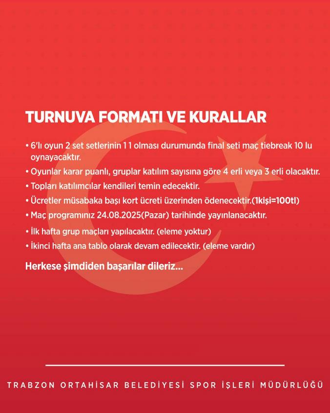 Ortahisar Belediyesi tarafından, 30 Ağustos Zafer Bayramı’nın 103. yılı dolayısıyla tenis turnuvası düzenlenecek. Belediye Başkanı Ahmet Kaya, bütün tenis severleri bu heyecan dolu turnuvaya katılmaya davet etti.