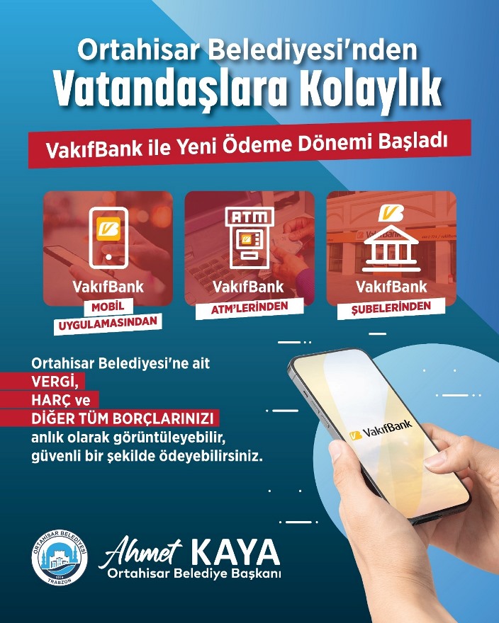Ortahisar Belediyesi Bilgi İşlem Müdürlüğü uhdesinde yapılan entegrasyonla birlikte, VakıfBank mobil uygulaması, VakıfBank ATM’leri ve VakıfBank şubeleri üzerinden Ortahisar Belediyesi’ne ait vergi, harç ve diğer tüm borçlar anlık olarak görüntülenebilecek ve ödeme işlemleri güvenle yapılabilecek. Bu yeni uygulama sayesinde vatandaşlar, belediyeye gelmeden, sıra beklemeden ve diledikleri zaman, istedikleri yerden ödeme yapabilme imkânına kavuştu.