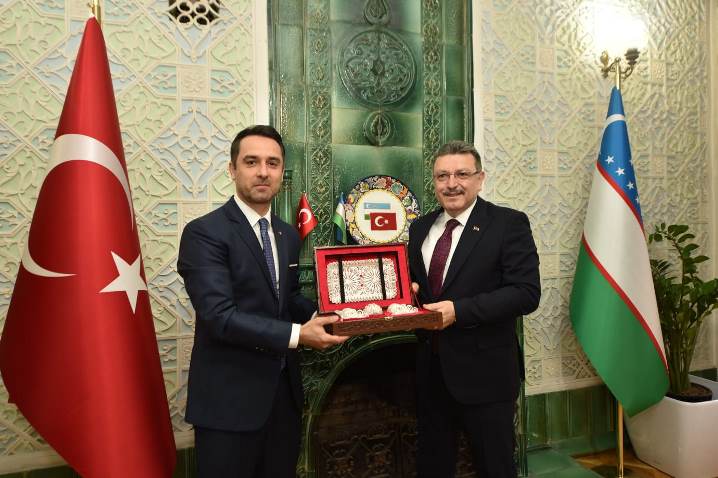 Trabzon Günleri etkinliklerinin açılış programı ve Buhara ile kardeş şehir protokolü imzalanması amacıyla Özbekistan’a giden Trabzon Büyükşehir Belediye Başkanı Ahmet Metin Genç, Türkiye’nin Taşkent Büyükelçisi Ufuk Ulutaş’ı makamında ziyaret etti. Görüşmede, iki ülke arasındaki kültürel ve ekonomik ilişkiler ile Trabzon’un uluslararası tanıtımı üzerine fikir alışverişinde bulunuldu. Ziyarete ayrıca, Trabzon Ticaret ve Sanayi Odası Başkanı Erkut Çelebi, Trabzon İl Kültür ve Turizm Müdürü Tamer Erdoğan, Özbekistan Cumhuriyeti’nin Trabzon Fahri Konsolosu Sadık Soylu ile Trabzon Büyükşehir Belediyesi’nin yetkilileri de katıldı.