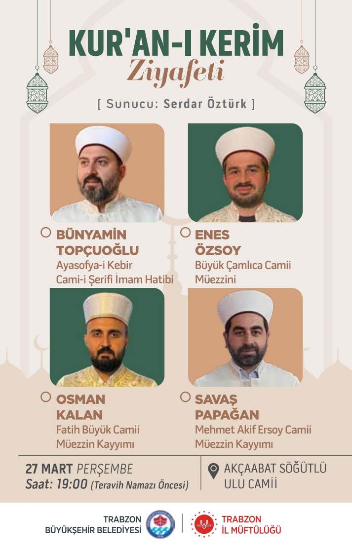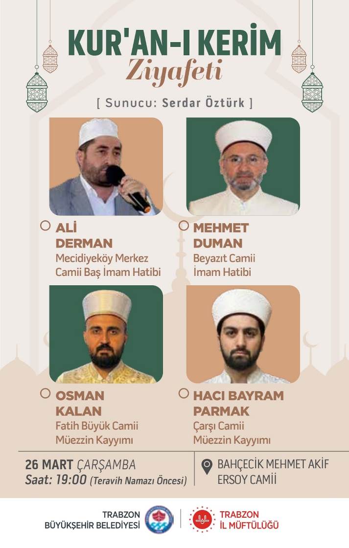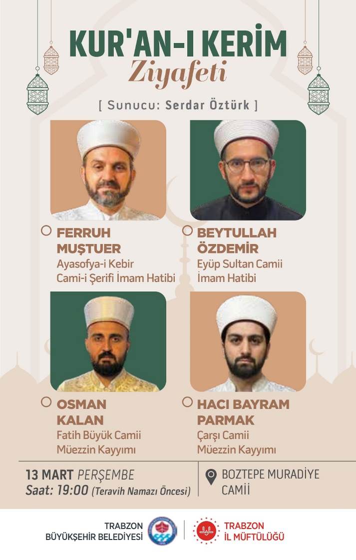 Ramazan ayı boyunca farklı camilerde vatandaşlara Kur’an-ı Kerim ziyafetleri sunulacak. 13 Mart Perşembe akşamı saat 19.00’da Boztepe Muradiye Camii’nde, Ayasofya-i Kebir Camii Şerifi İmam Hatibi Ferruh Muştuer, Eyüp Sultan Camii İmam Hatibi Beytullah Özdemir, Fatih Büyük Camii Müezzin Kayyımı Osman Kalan ve Çarşı Camii Müezzin Kayyımı Hacı Bayram Parmak ile Kur’an-ı Kerim ziyafeti sunulacak. 20 Mart Perşembe akşamı saat 19.00’da Pelitli Sahil Camii’nde Kurra Hafız Abdurrahman Sadien, Büyük Çamlıca Camii İmam Hatibi Kerim Öztürk, Fatih Büyük Camii Müezzin Kayyımı Osman Kalan ve Mehmet Akif Ersoy Camii Müezzin Kayyımı Savaş Papağan’ın katılacağı program düzenlenecek. 26 Mart Çarşamba akşamı saat 19.00’da Bahçecik Mehmet Akif Ersoy Camii’nde, Mecidiyeköy Merkez Camii Baş İmam Hatibi Ali Derman, Beyazıt Camii İmam Hatibi Mehmet Duman, Fatih Büyük Camii Müezzin Kayyımı Osman Kalan ve Çarşı Camii Müezzin Kayyımı Hacı Bayram Parmak Kur’an ziyafeti sunacak. 27 Mart Perşembe akşamı saat 19.00’da Akçaabat Söğütlü Ulu Camii’nde, Ayasofya-i Kebir Cami-i Şerifi İmam Hatibi Bünyamin Topçuoğlu, Büyük Çamlıca Camii Müezzini Enes Özsoy, Fatih Büyük Camii Müezzin Kayyımı Osman Kalan ve Mehmet Akif Ersoy Camii Müezzin Kayyımı Savaş Papağan’ın katılacağı program düzenlenecek.