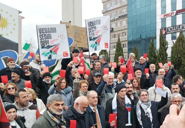 Rize Cumhuriyet meydanında Gazze’de yapılanlara tepki amacıyla siyasi parti teşkilatları tarafından Trump’a kırmızı kart gösterildi.