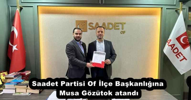 Saadet Partisi Of İlçe Başkanlığına atanan Musa Gözütok karar sonrası yaptığı ilk açıklamada, “Gerek ilçe yönetiminde bulunan gerekse Of’umuzda yaşayan ve ilçe başkanı olmamızı canı gönülden destekleyen herkese teşekkür ederim.” dedi.