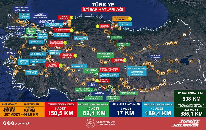 Lojistik Koordinasyon Kurulu tarafından onaylanan 17 kilometrelik 8 iltisak hattı bulunduğunu belirten Uraloğlu, 82,4 kilometrelik 10 projeyi tamamladıklarını; 189,4 kilometrelik 17 iltisak hattının ise proje çalışmalarının devam ettiğini kaydetti. Bakan Uraloğlu, “Şu anda mevcut hatlarımızın yanı sıra yapımı devam eden ve etüt edilen hatlarımız da tamamlandığında 885,1 kilometre uzunluğunda 331 adet iltisak hattımız olacak. 12. Kalkınma Planı kapsamında ise 2028 yılında iltisak hattı uzunluğunu 608 kilometreye ulaştırmayı hedefliyoruz.” şeklinde konuştu.