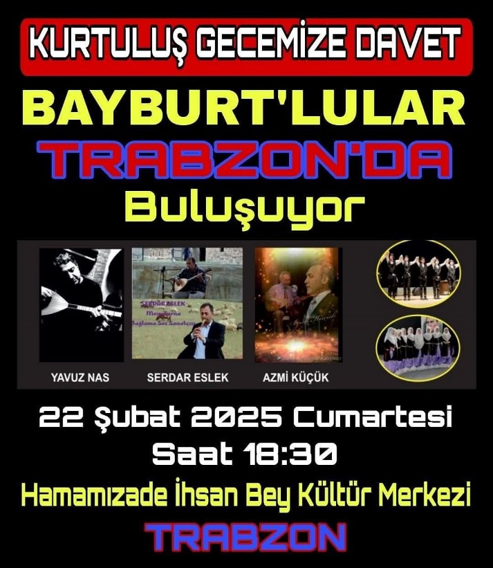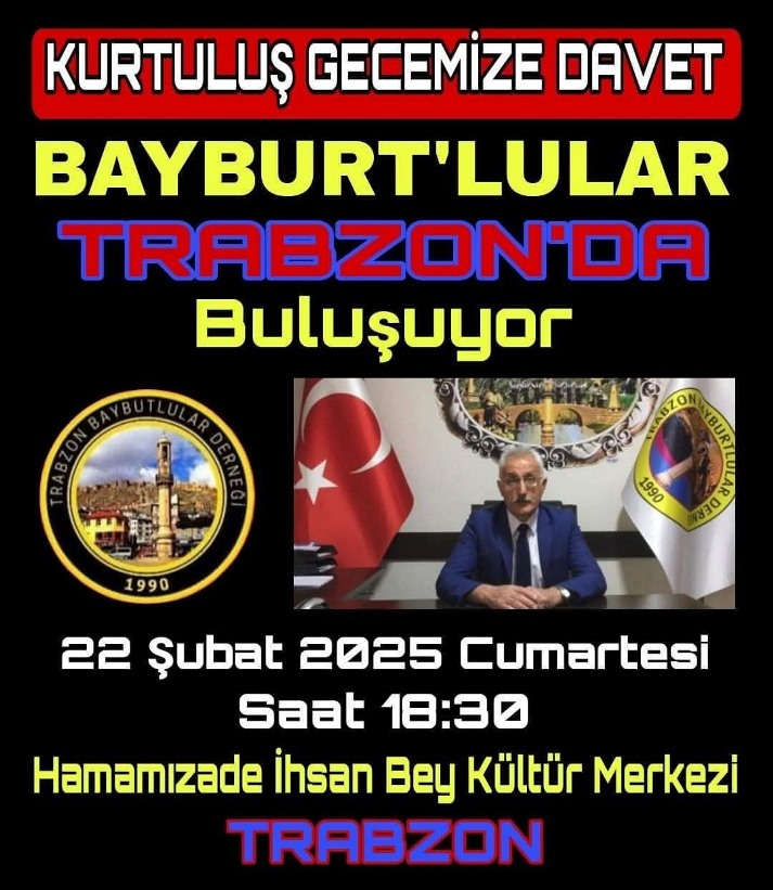 Trabzon Bayburtlular Derneği olarak “Bayburtlular Trabzon’da Buluşuyor” sloganı ile 22 Şubat 2025 Cumartesi günü saat 18.30’da Trabzon Hamamizade İhsanbey Kültür Merkezinde Bayburt’un Düşman işgalinden Kurtuluşunun 107. Yıldönümünü unutulmaz bir gece ile kutlayacağız. Vatandaşlarımıza bu muhteşem etkinlikte doyasıya eğlenerek unutulmaz bir gece yaşamayı, kültürümüzü gelecek nesillere aktarmayı, bölge insanımızın çektiği zorlukları, çileyi, acıyı, yaşadığı mutluluğu çok yönlü olarak anlatacağız” dedi.