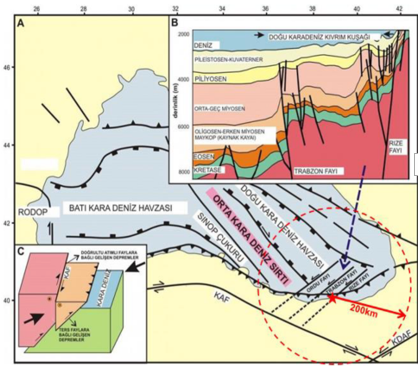 Görüntü: Karadeniz’in Aktif Tektoniğini Oluşturan Fay Sistemine Ait Sismo-Tektonik Harita (A), Doğu Karadeniz’de Yapılan Sismik Çalışmalardan Elde Edilen Jeofizik Kesit (B) ve Bölgenin Tektoniğini Açıklayan Blok Diyagramı