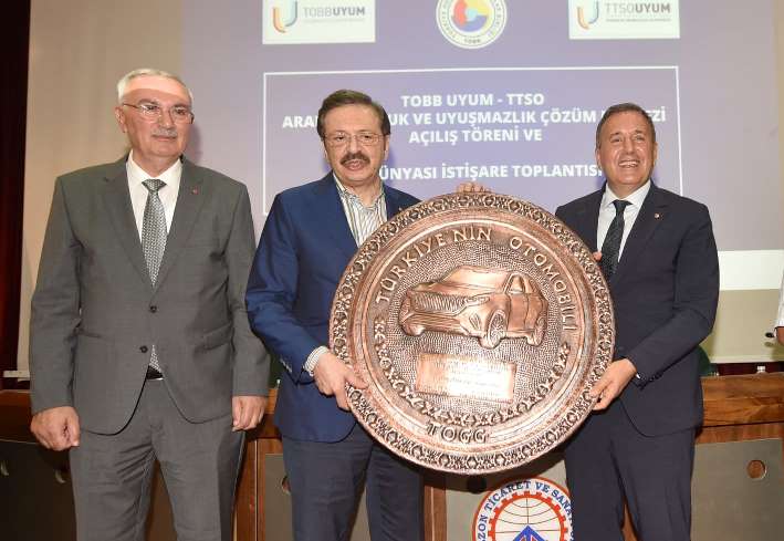 TTSO Başkanı Erkut Çelebi ve Meclis Başkan Yardımcısı Selçuk İskender, açılış konuşmalarının ardından TOBB Başkanı M. Rifat Hisarcıklıoğlu’na, üzerinde Türkiye’nin Otomobili TOGG yazan ve TOGG’un kabartma bir modeli bulunan bakır el sanatı ürünü hediye etti. Çelebi ve İskender ayrıca eski TBMM Başkanı Cemil Çiçek’e de telkâriden kahve fincanı takımı hediye etti.