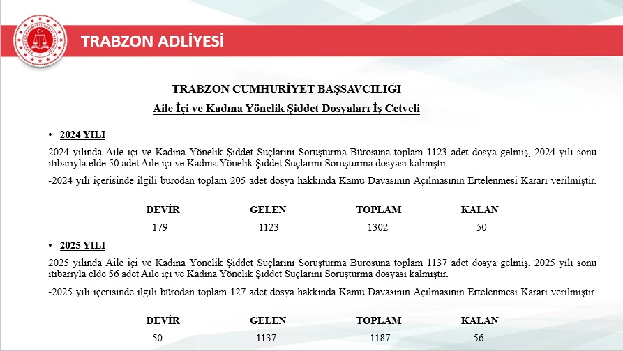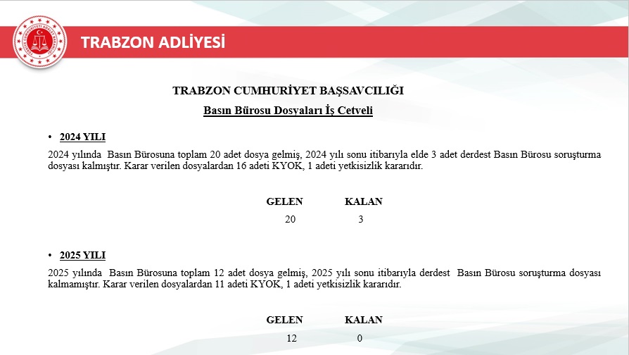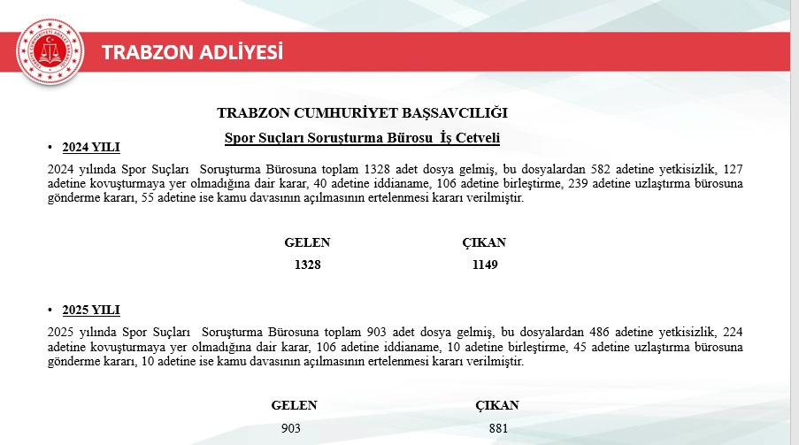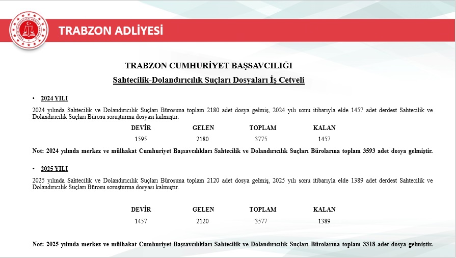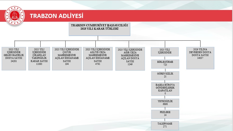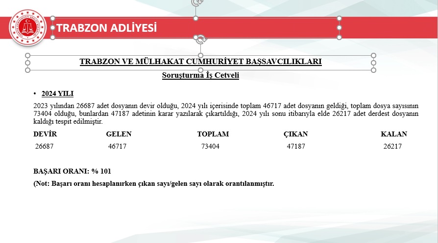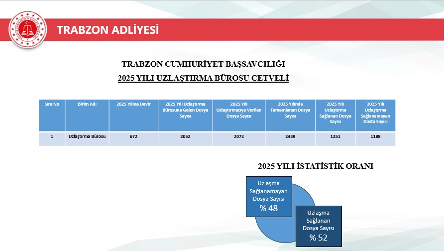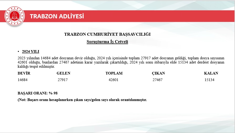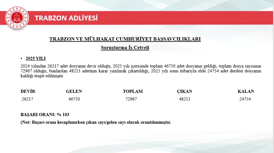 2025 yılı içerisinde Trabzon merkez ve ilçelerinde toplam 46.750 yeni dosya sisteme girdi. Geçmiş yıllardan devreden dosyalarla birlikte toplam işlem gören dosya sayısı 72.967’ye ulaştı. Aynı yıl içerisinde 48.213 dosya karara bağlanarak sonuçlandırıldı. Böylece dosya çözüm oranı, gelen dosya sayısının üzerine çıkarak %103 seviyesine ulaştı. Yıl sonu itibarıyla 24.754 dosya karara bağlanmayı beklerken, bu performans adliyenin işleyiş verimliliğinde önemli bir başarı olarak değerlendirildi.
